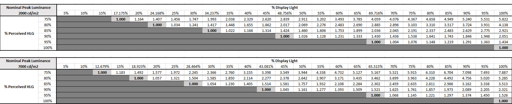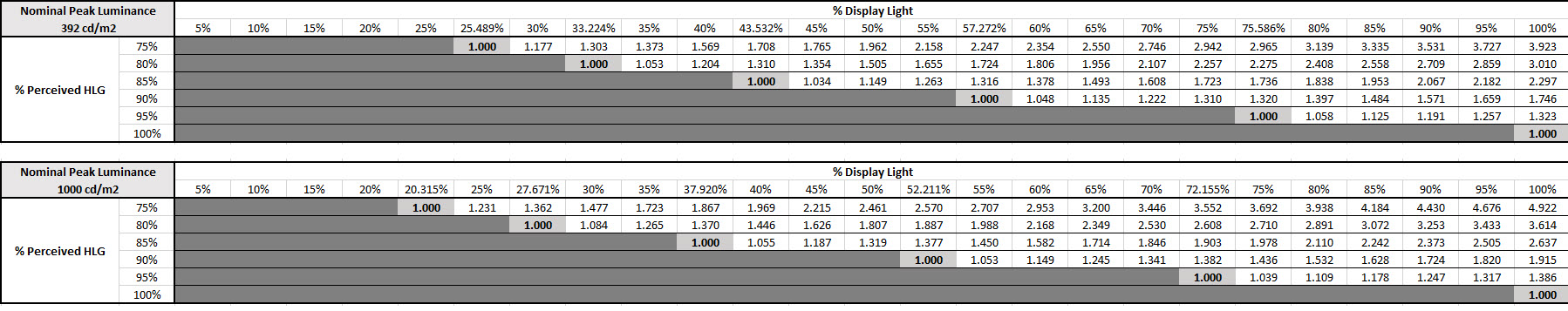 As an example, if the chosen "HDR Transcode HLG OOTF Lw Value" is 392 cd/m2, then the first table would be used to find the scalar. If the desire was to map 75% Perceived HLG to 100% Display Light, the "HDR Transcode Display Light Scalar' would be set to 3.923.