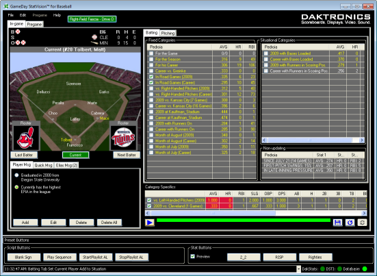 StatVision significantly reduces pregame and in-game operations by instantly analyzing large amounts of statistical data from sources such as DakStats® Baseball, MLB.com, and Elias Sports Bureau. The data is pulled up in easy to use categories that vary depending on the current game situation.