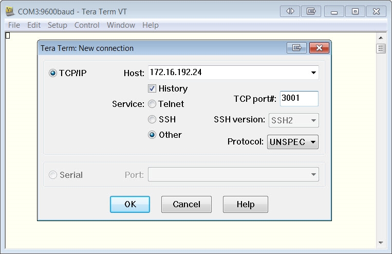 - Type in the TCP port # (3001 should normally be used) and the press OK (the Protocol shouldn't need to be specified)