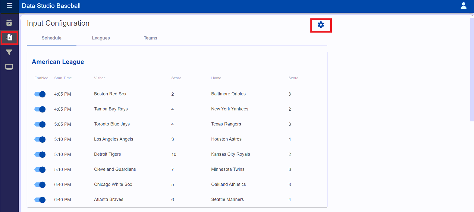 - Click on the hamburger icon in the top left corner to expand the left side menu and choose Inputs. Click on the Gear Icon in the upper right to access Schedule Settings.