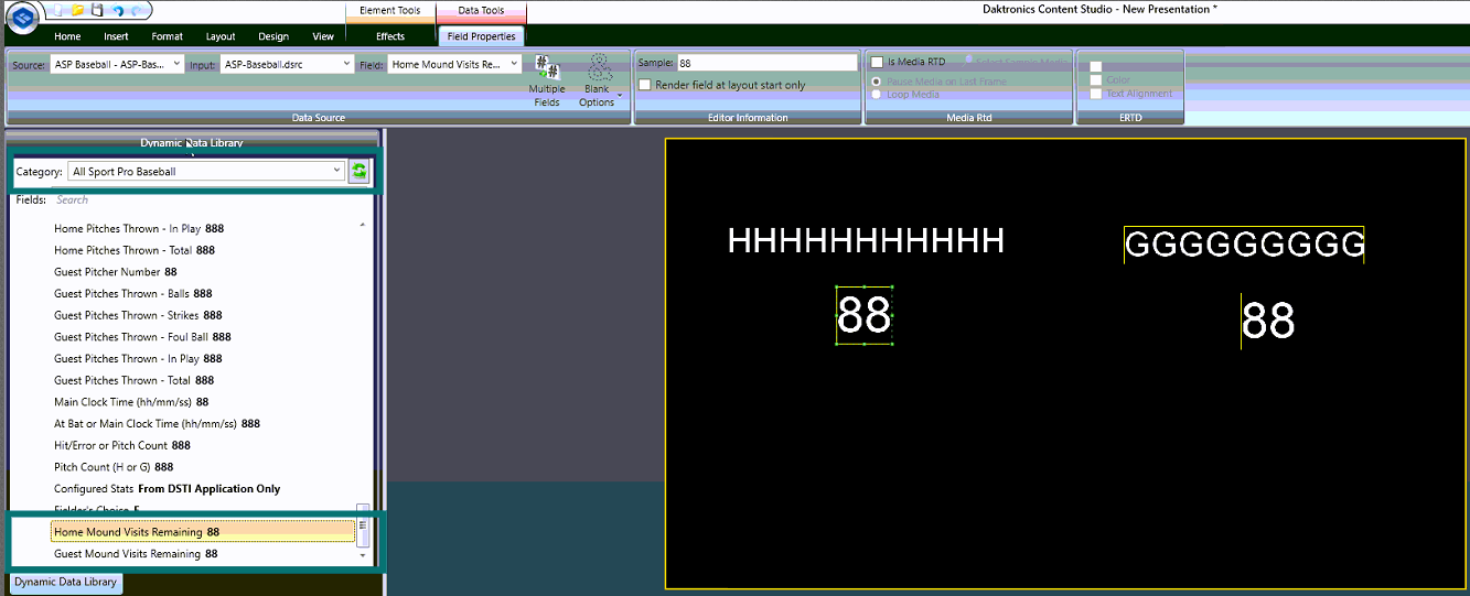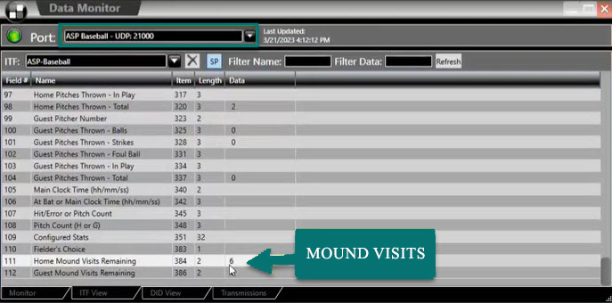 To make content that displays mound visits, use the ASP Baseball ITF/DID in your Show Control Data Profile.In content studio you will be able to pull the mound visits data field from the "All Sport Pro Baseball" profile under Home Mound Visits and Guest Mound Visits