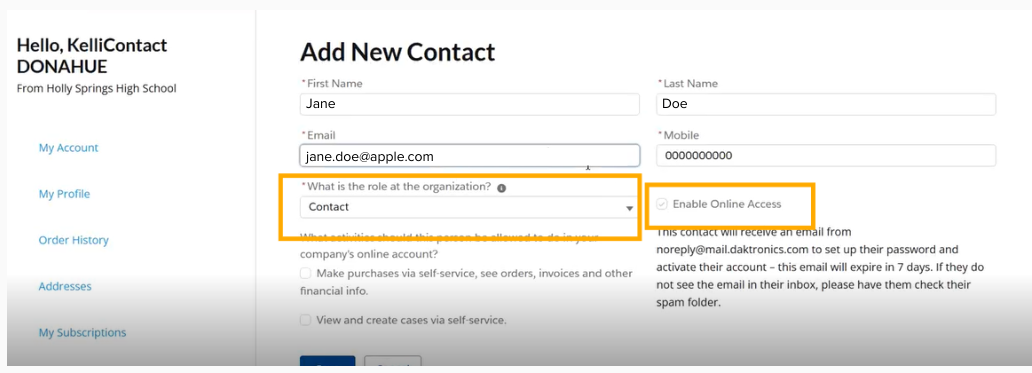 - If your Contact is not in the list, click Cancel and navigate to My Account and Add New Contact. Step by step instruction can be found in the last section of this article, "Adding Contacts to Your Daktronics Online Account." Once complete, follow the steps above to add the Admin.