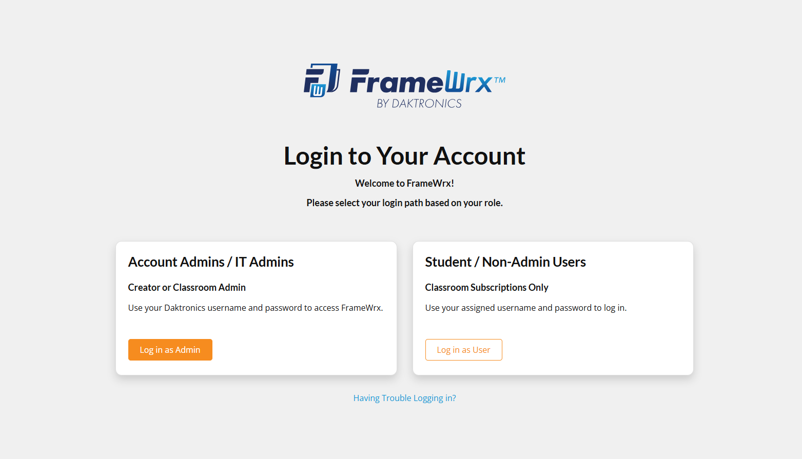 The FrameWrx login page includes two clearly labeled login options — just choose the one that matches your role type.
