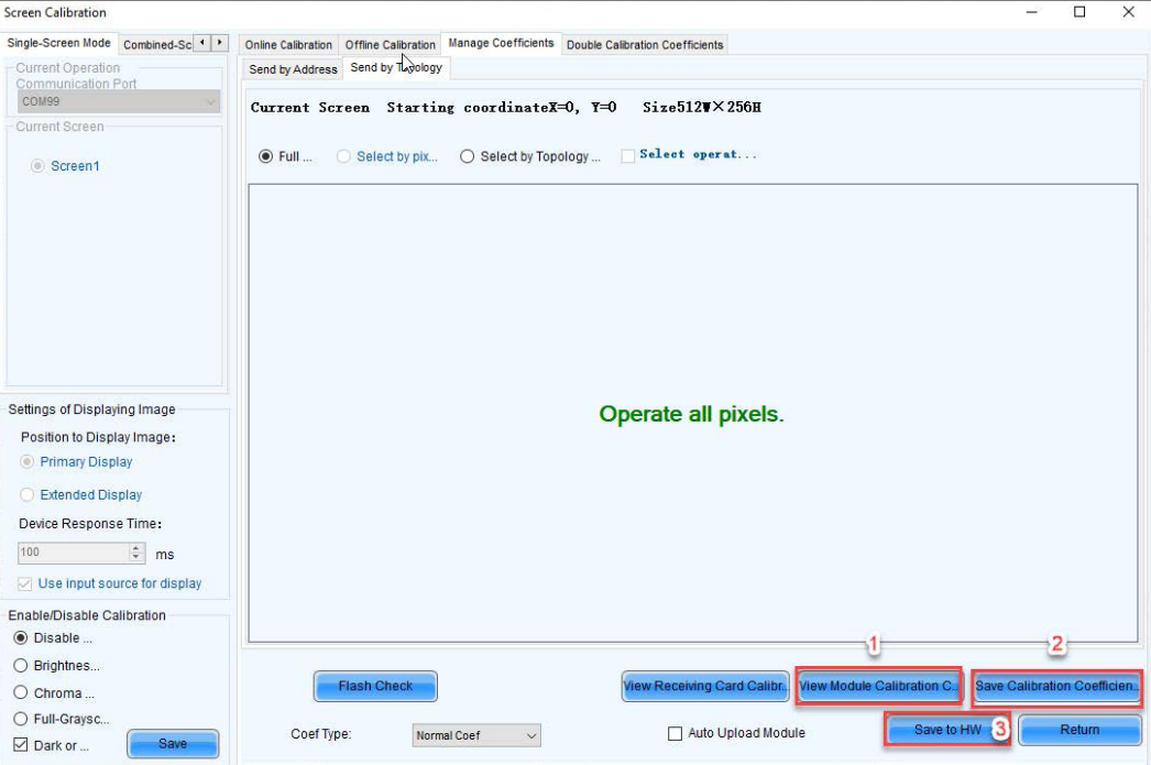 For NPN-4600 COB displays, there are calibration data (also called Coefficients) saved on modules. When we install the display, we need to read calibration data from modules and upload data to the receiver cards.