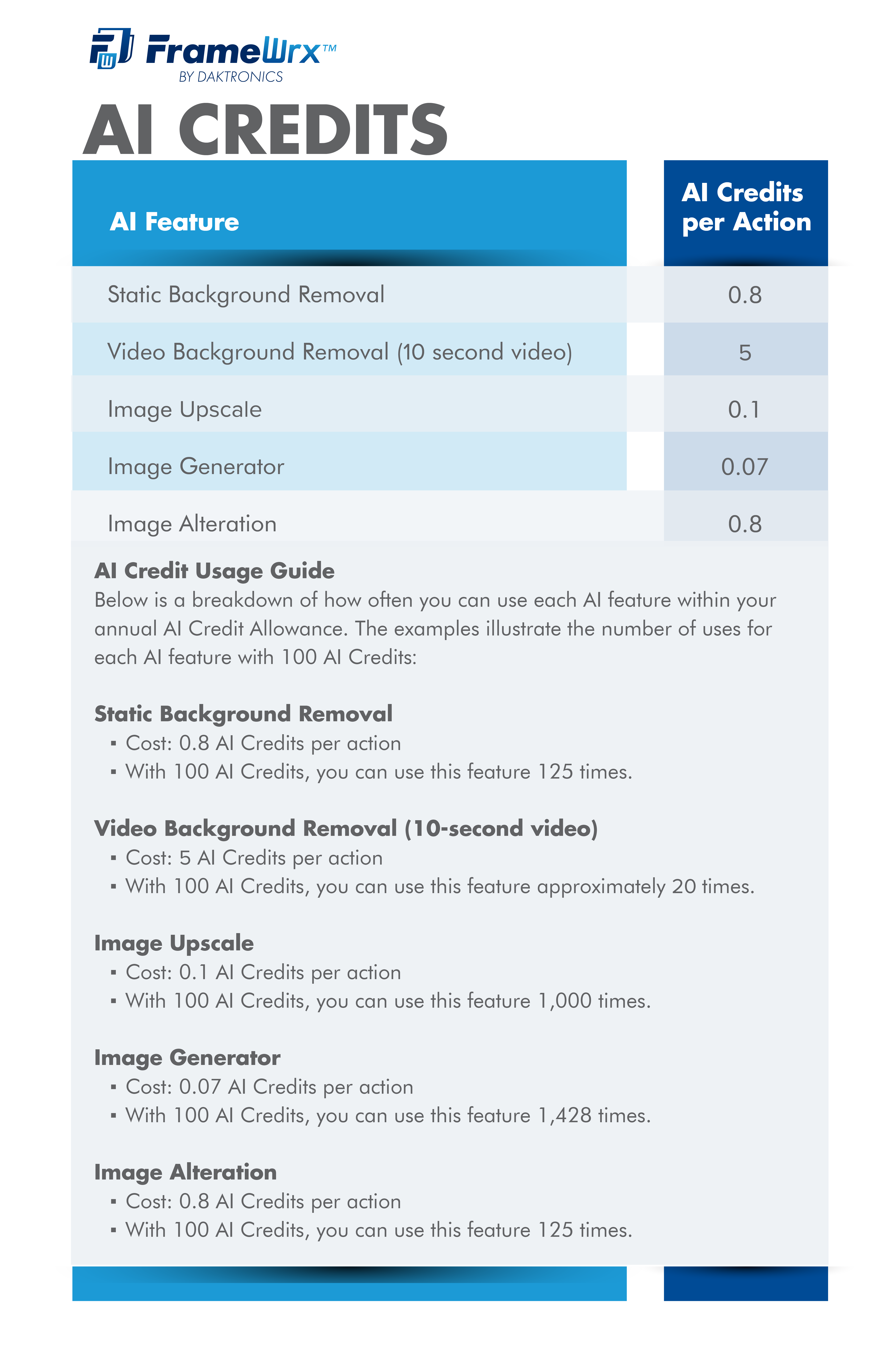 A FrameWrx subscription includes a pre-set amount of AI credits based on the subscription type. Credits can be used for AI features such as image generation, image alteration, and image or video background removal.
