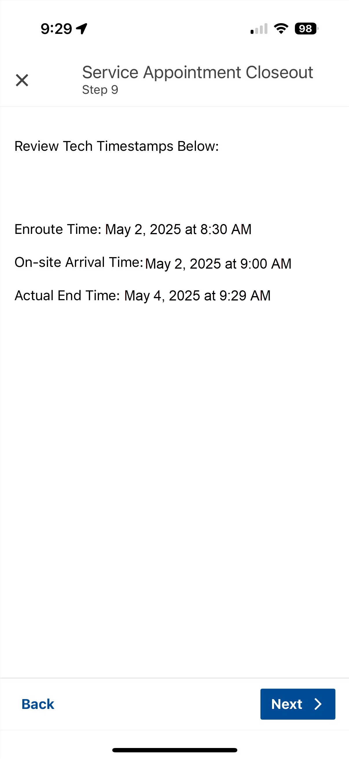 In the example below, this technician failed to complete any of the required steps throughout the service appointment within the app. As the tech is completing all steps on May 4th, they progress to the Service Appointment Closeout. the Enroute Time and On-Site Arrival was captured each time you tapped "Update Status" in prior steps, and is now editable to be corrected with the accurate times from May 2nd.