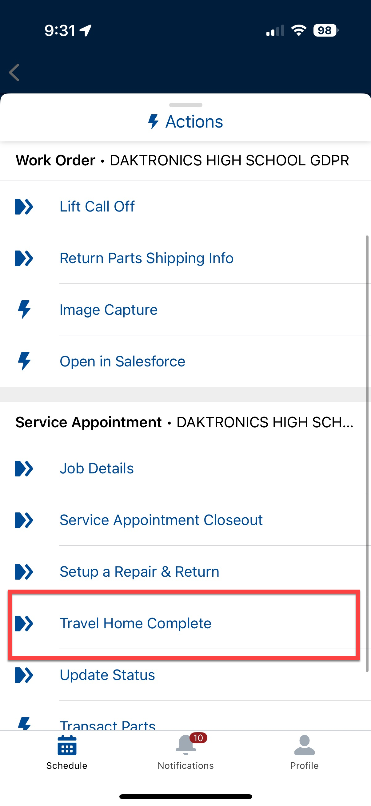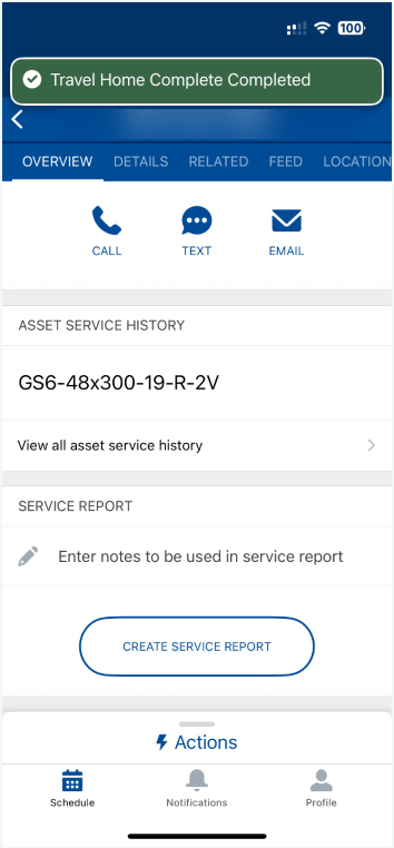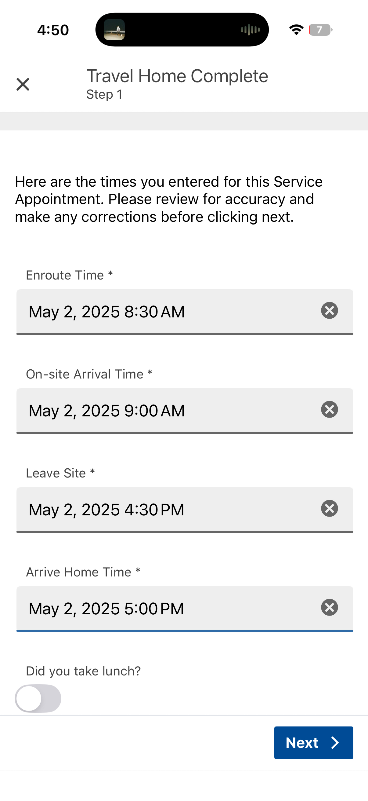 After you have entered the correct Travel Home Complete timestamp, tap on Next to return to the overview of the Service Appointment.