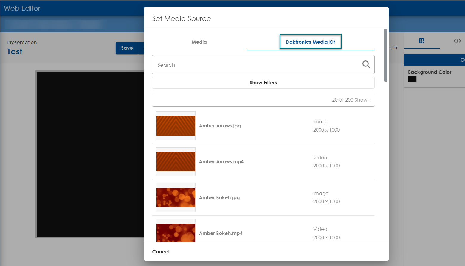 The Daktronics Media Kit is a library of free media available to Venus Control Suite users and is accessible through the Web Editor and Scheduling Apps.