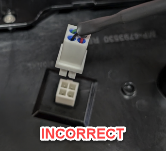- Incorrect cable in use, black and red should not be on top when viewed from above module, and green and white should not be nearest the molex latching mechanism: