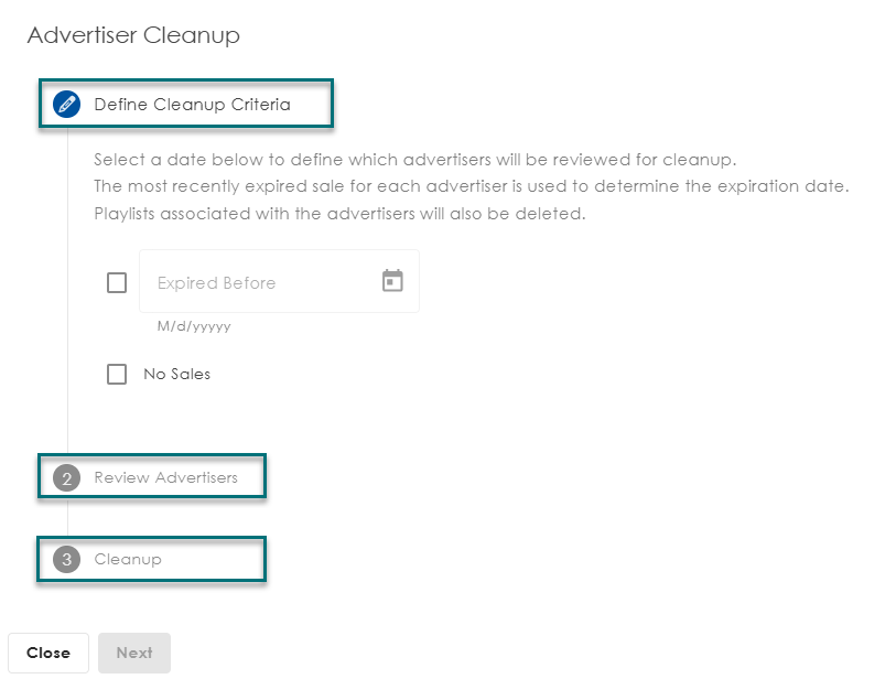 How to remove expired or unused advertisers and associated playlists using the Advertiser Cleanup Wizard.