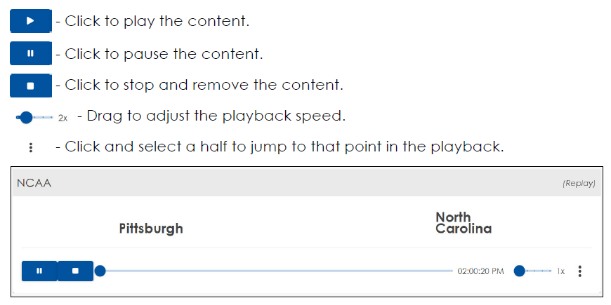 Once a game or replay is scheduled, use the Dashboard to control playback: