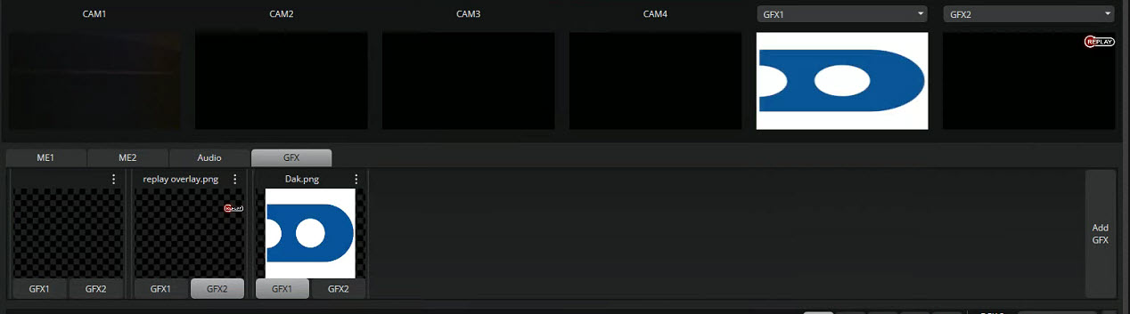 - Select Add GFX and choose a graphic file (PNG format, 1280x720 or 1920x1080).