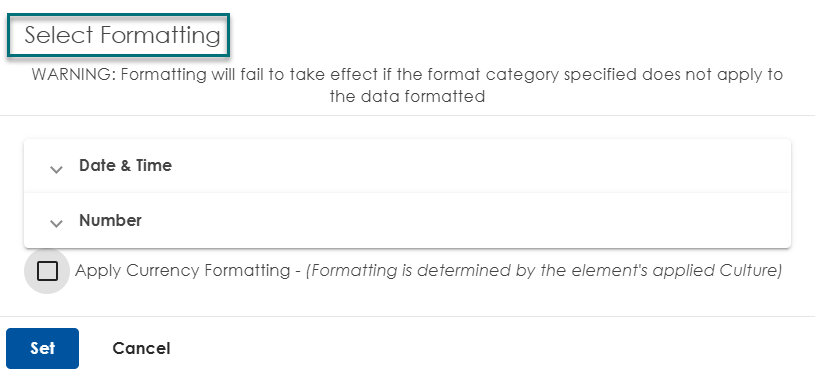 - Apply Currency Formatting: Automatically formats the data using the currency symbol and style defined by the element’s applied culture or locale.