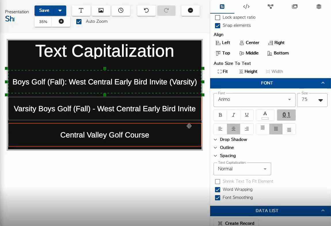 Adjust how your text looks by changing capitalization, shrinking to fit element, or allowing it to wrap for easier reading.