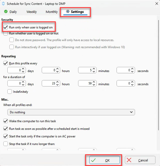 Click on the Settings tab, then check the box to 'Run only when user is logged on', and press OK twice to close out the scheduling.