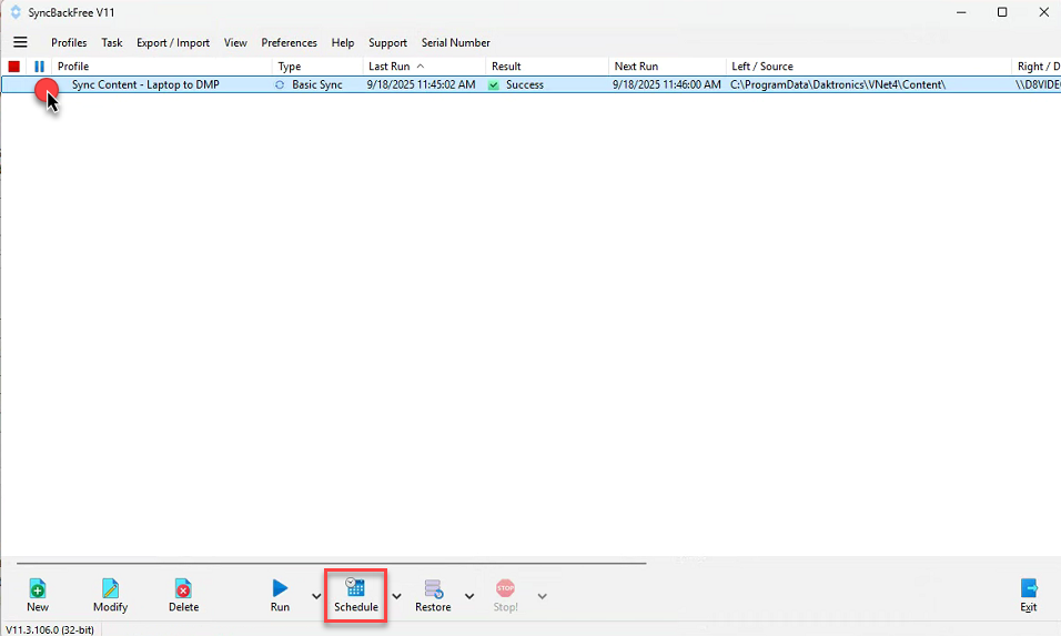 Click on the content mirror profile and click the Schedule button and select
