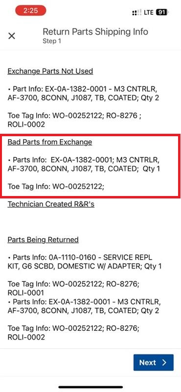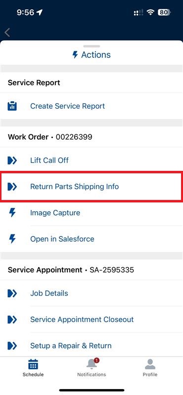Note: If you have transacted an EX-xxxx-xxxx part, the return process will be initiated and toe tag info will be found by going to the Service Appointment Overview under Work Order, and clicking on "Return Part Shipping Info" to view all information for the creation of the physical toe tag to attached to the part.