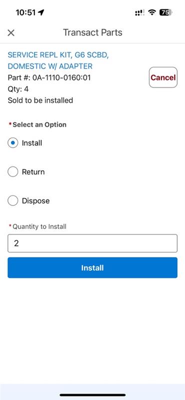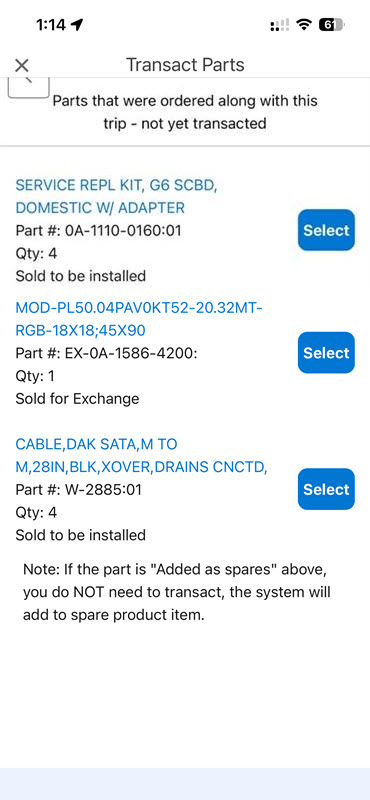 4. This will show all parts that were ordered for this Service Appointment that have not yet been transacted. One-by-one, tap Select next to the part(s) you would like to transact.