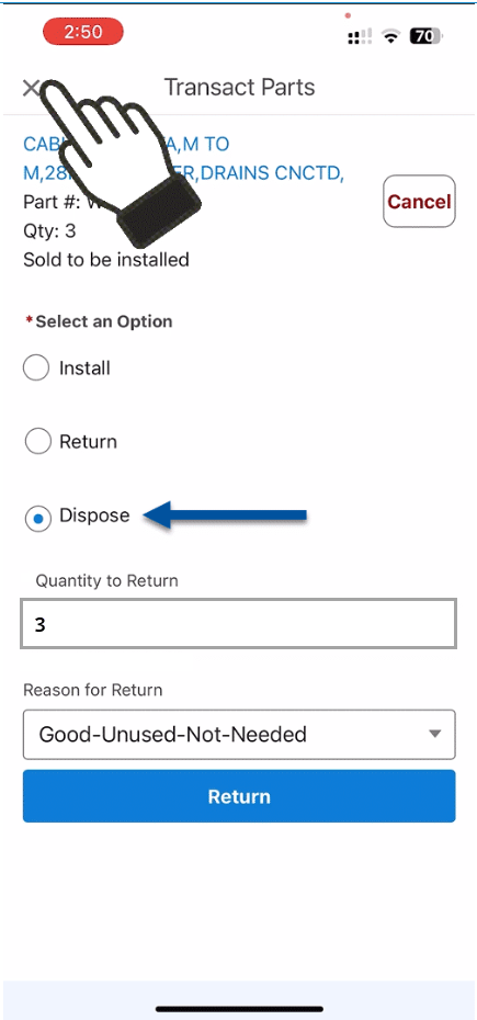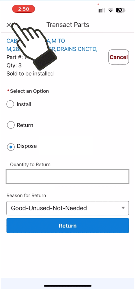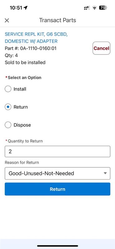 6. Select return, the quantity of the return, and the reason for the return. Once completed, tap Return at the bottom of the screen.