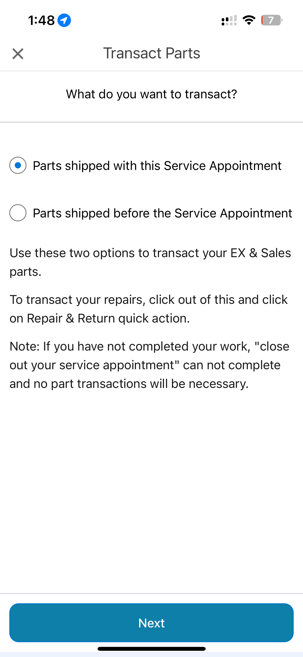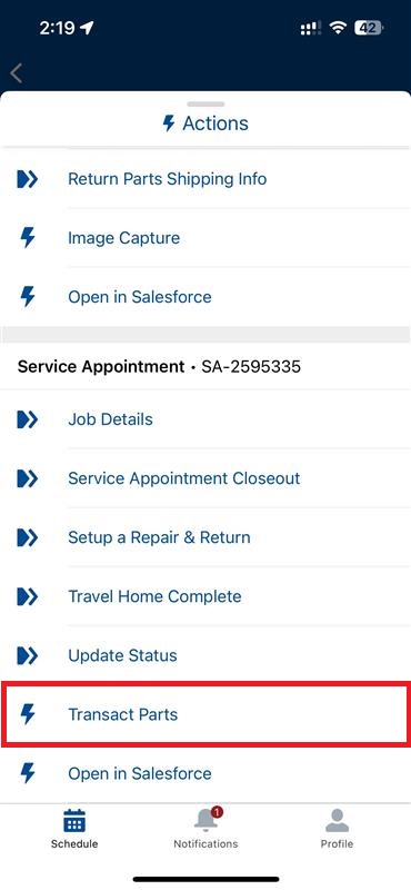 2. Under the Service Appointment, tap on Transacting Parts.