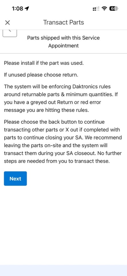 8. If you are able to leave the part on-site, please exit Transact Parts and resume your work.