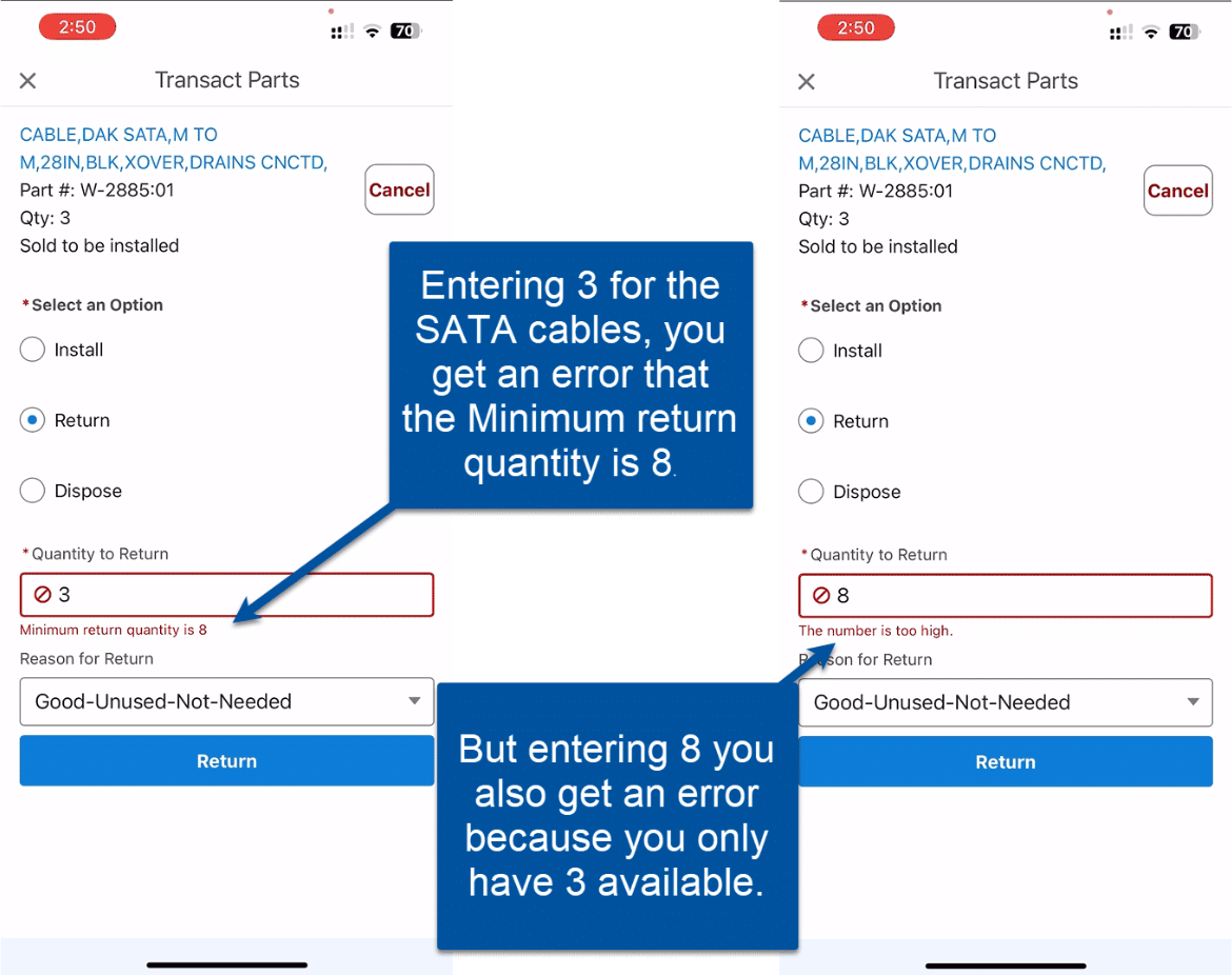 In this example below, we attempted to return the 3 Satas, but the system has a minimum quantity of 8 before they are returnable. To further show that this is unavoidable, we will tell the system that we want to return a quantity of 8, but the system will remind us that we