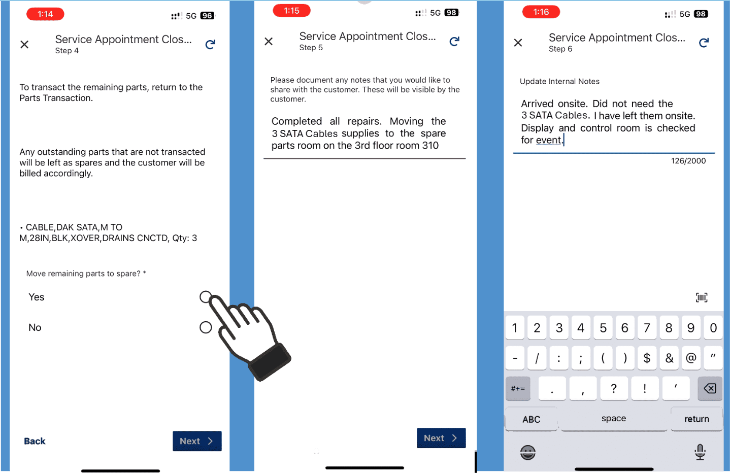 9. In the Service Appointment Closeout step, will be asked if you would like to leave the parts yet to be transacted to be left on-site as Spares. Chose Yes to move the parts to spares to complete the transaction of the parts.