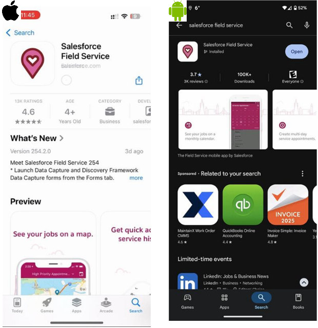 Download the Salesforce Field Service mobile app that is found in the App Store for Apple devices and the Google Play Store for Androids devices.