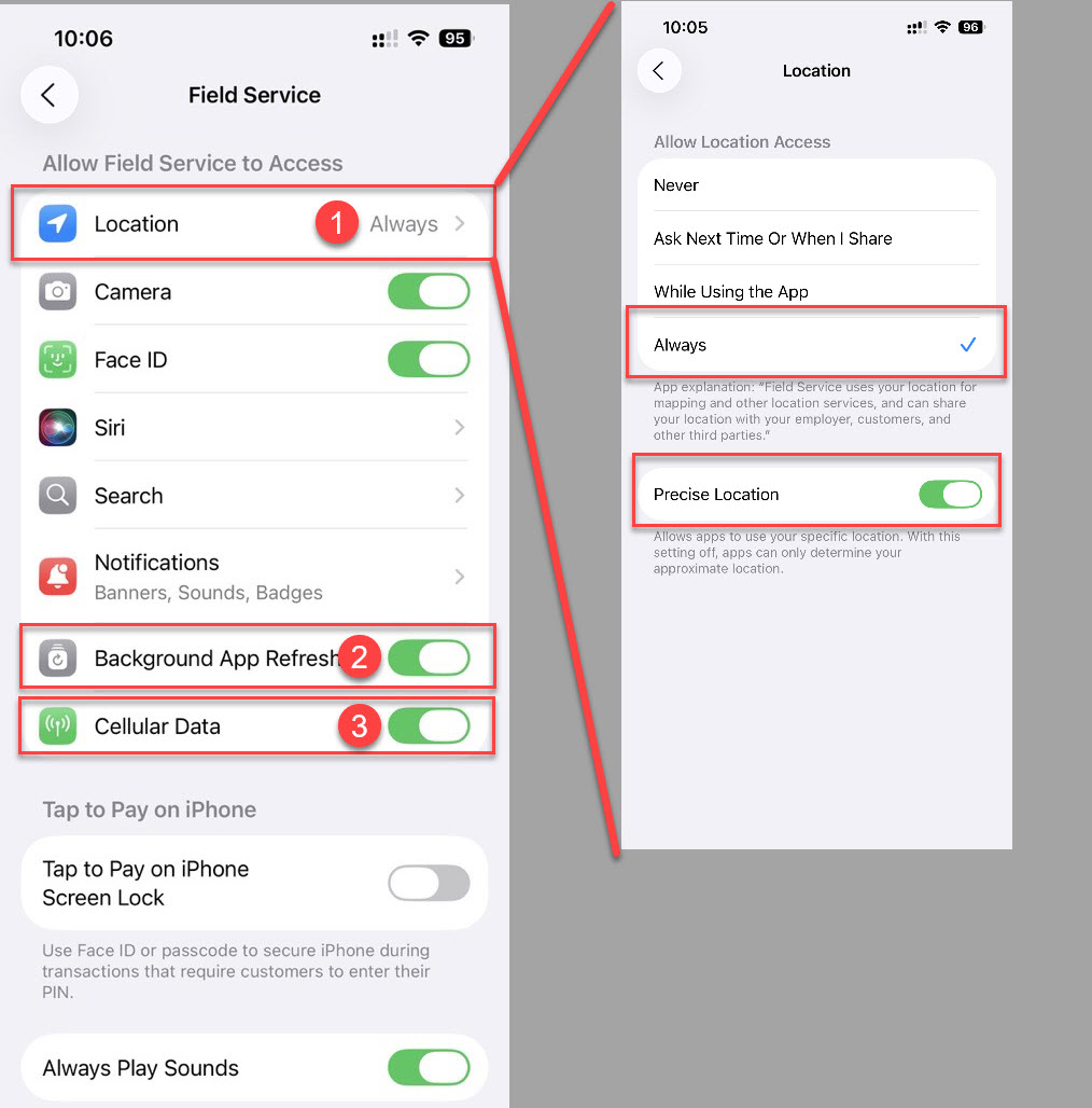 Note: Setting the Field Service Mobile App Location Services to Always will allow you to stay connected to the Salesforce Server.