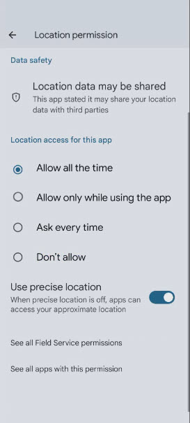 Note: In the App, select "Precise" and "While using the app". Next, go to your Field Service App in your device settings and adjust the Location Permissions to "Allow all the time" to maximize your location accuracy.