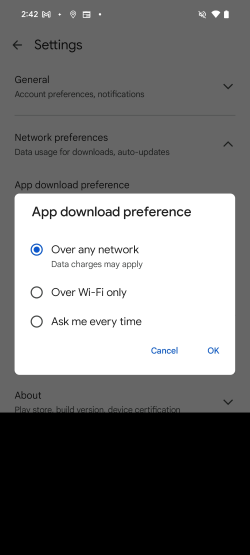 Google Play Store > Profile > Settings > Network Preferences >App Download Preference