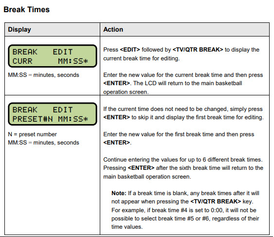 - Continue entering the values for up to 6 different break times. Pressing <ENTER> after the sixth break time will return to the main basketball operation screen.