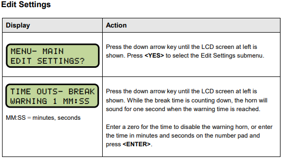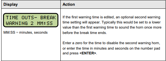 - Press the down arrow key until you see TIME OUTS- BREAK WARNING 1 MM:SS and set this first warning to 15 seconds, then press <ENTER>.