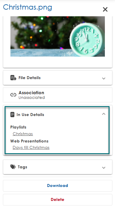 💡Note: A media item may appear In Use even if the Playlist is not actively displaying content. This helps ensure media is not removed while still attached to future schedules.