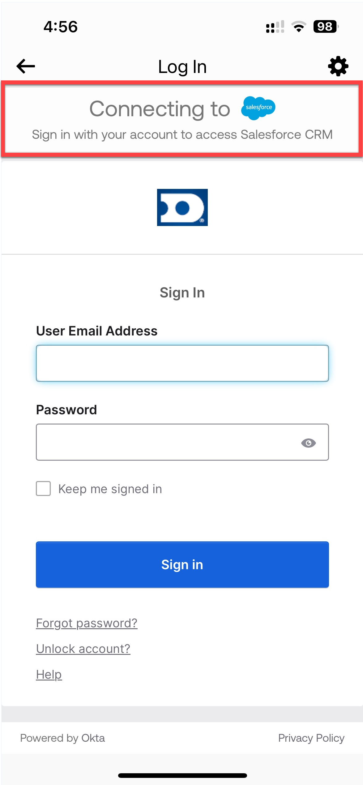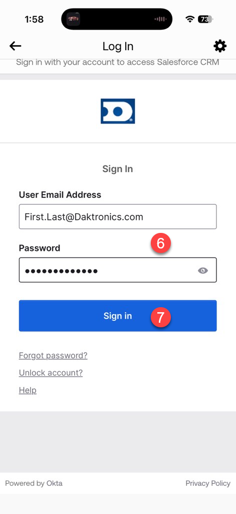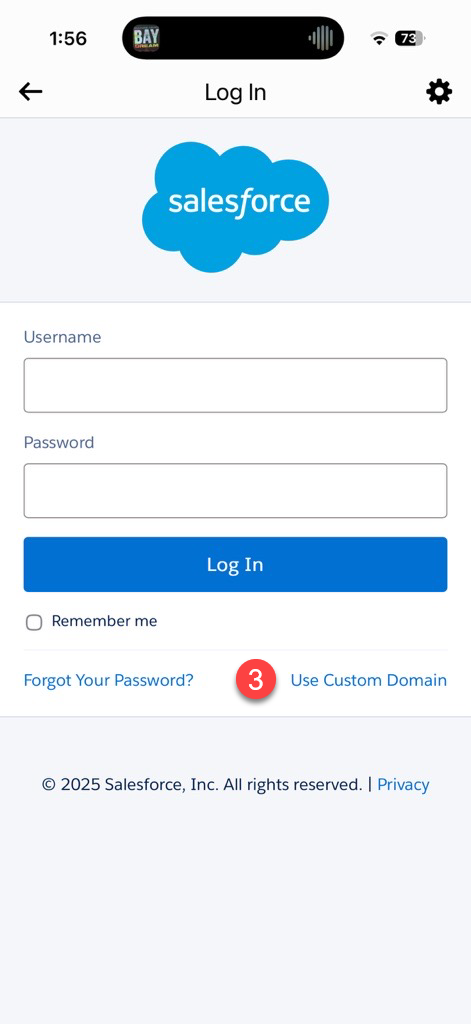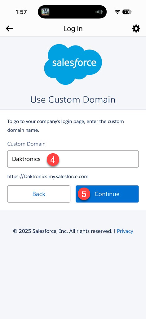 Next, you will tap Use Custom Domain, and enter "Daktronics" to create the custom connection. You will then be brought back to a log-in screen, but now, you will see Salesforce CRM at the top of your screen.