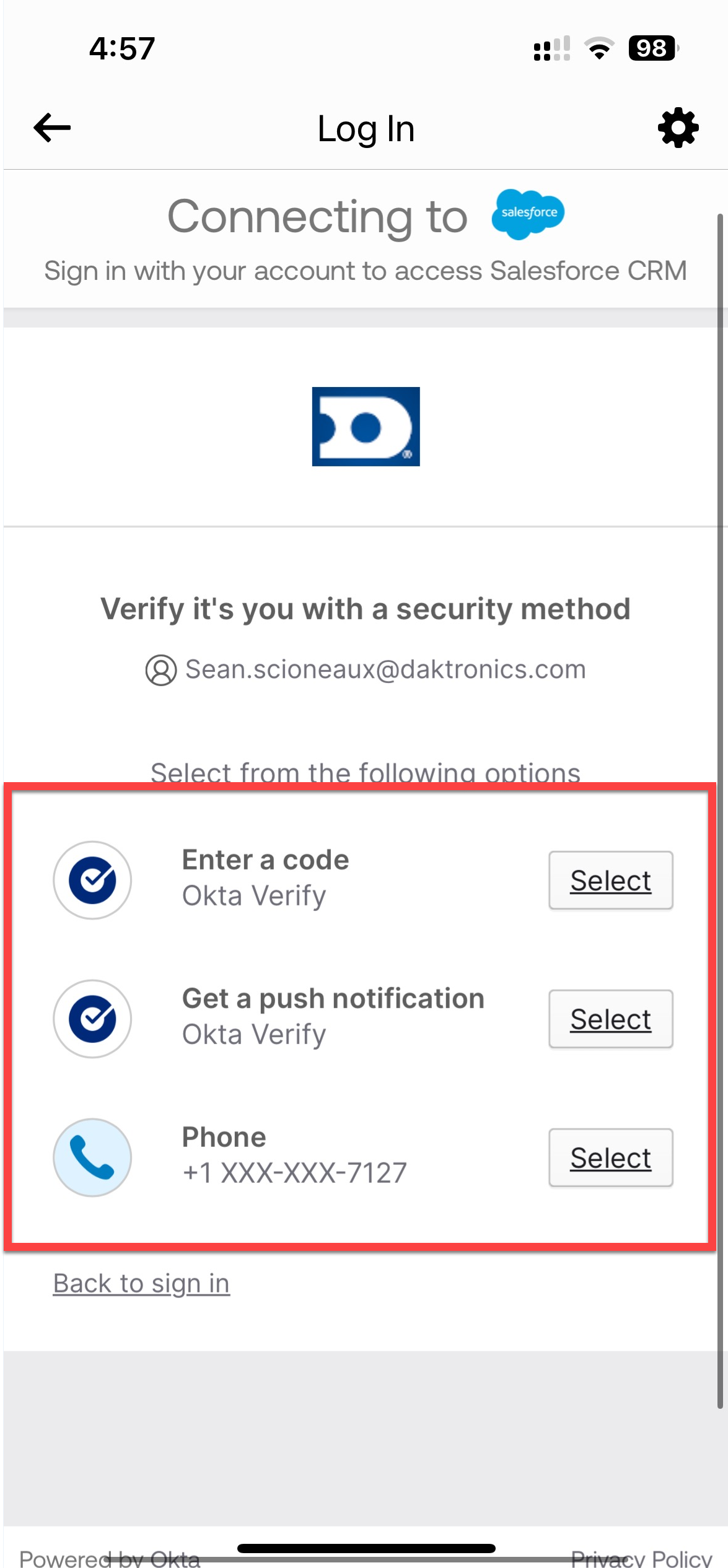 Use your employee credentials to log in and complete the OKTA verify authentication.