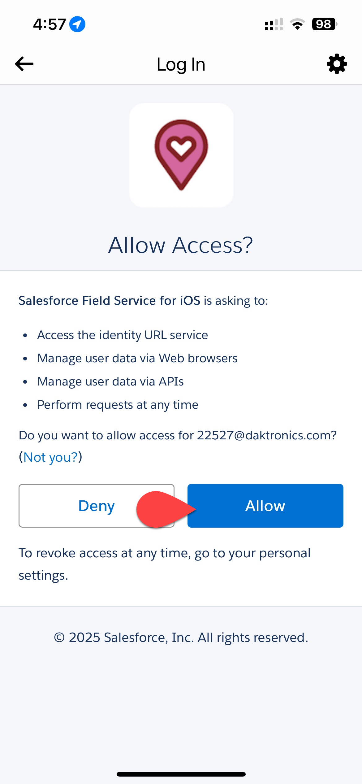 Finally, Tap Allow to complete the setup process and arrive at your Service Dashboard to confirm you have correctly logged in to the Daktronics Production server of Salesforce.