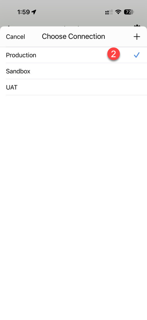 Once you open the app and proceed through the introduction and key features, you will be presented the log-in screen. DO NOT ATTEMPT TO LOG IN YET. First, let's confirm the connection that is selected. Tap the gear icon in the top right corner of the screen to see the list of connections; make sure Production is checked and return to the log-in screen.