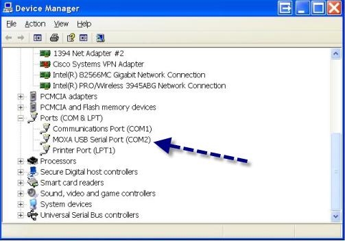 - This will display any installed COM ports on the computer. Look for MOXA USB Serial Port (COM#). (see picture below)