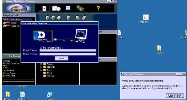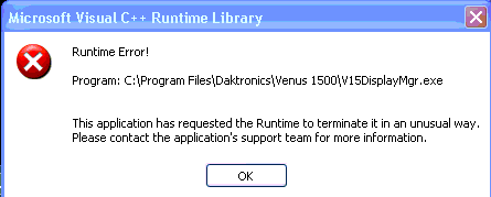 - When getting status, get a C++ Runtime error: C:\Program Files\Daktronics\Venus1500\V15DisplayMgr.exe