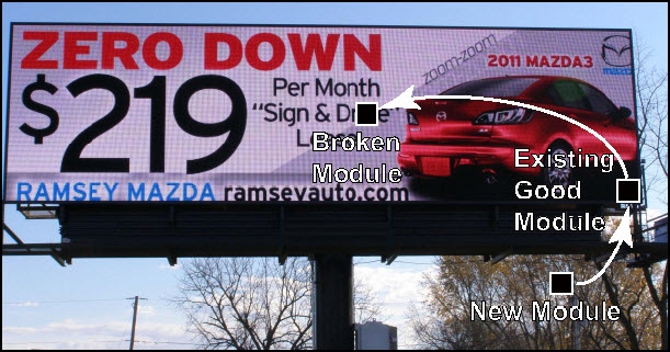 - Since the LEDs degrade over time it is possible that when a new module is installed in an existing display that it may not match the surrounding modules exactly. In an effort to minimize the patchwork effect caused by replacing modules, Daktronics recommends implementing the following as a best practice every time you replace a module in a display.