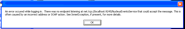 - Error received when attempting to launch software: "An error occurred while logging in. There was no endpoint listening at net.tcp://localhost:9245/NucleusEventsService that could accept the message. This is often caused by an incorrect address or SOAP action. See InnerException, if present, for more details."