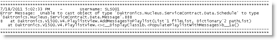 - Unable to cast object of type 'Daktronics.Nucleus.ServiceContract.Data.Schedule' to type 'Daktronics.Nucleus.ServiceContract.Data.Message'. at Daktronics.V1500.V4.PlaylistView.AddMessagesToPlaylist(List`1 fileList, Dictionary`2 pathList) at Daktronics.V1500.V4.PlaylistView.<>c__DisplayClass1b.<PopulatePlaylistWithMessages>b__1a()