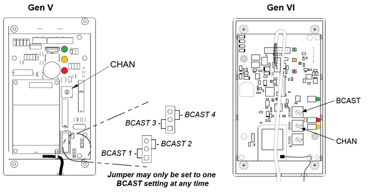 - Gen V (blue label): Use a small flathead screwdriver to turn the CHAN rotary switch to a new channel (1-8). Move the jumper wire on the J4 or J5 BCAST jacks to a new broadcast group (1-4) as needed. Broadcast groups 2 and 4 may only use channels 1-4.