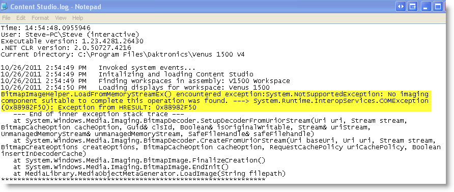- The media library plug-in is trying to load files either from Daktronics Library folder or another folder location that has a bad file. When it tries to load the bad file, it causes an error and crashes Content Studio and shows an error in Content Studio.log file.
