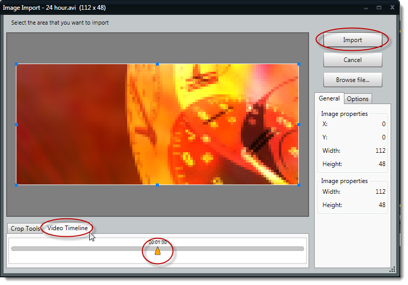 - Slide the arrow on the Slider to choose which still or frame you want to import in.