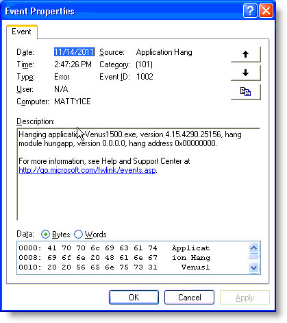 In Windows Event Viewer shows software receives an Application Hang Error.