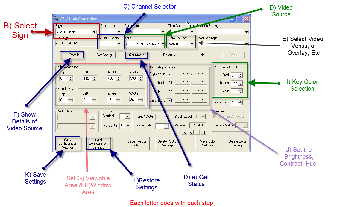 J) Then once the video is showing on the display, you may have to do some adjustments to the Brightness, Contrast, Hue, and Saturation by moving the sliders from side to side.