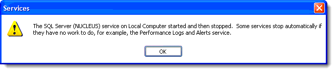 - If you get error "The SQL Server (Nucleus) service on local computer started and then stopped. Some services stop automatically if they have no work to do, for example, the performance logs and alerts services." (Screen shot below), follow Receiving "Windows could not start the SQL Server (NUCLEUS) service on Local Computer" when trying to open Venus 1500 v4 software, DD2004044 to change the Service to Local System.