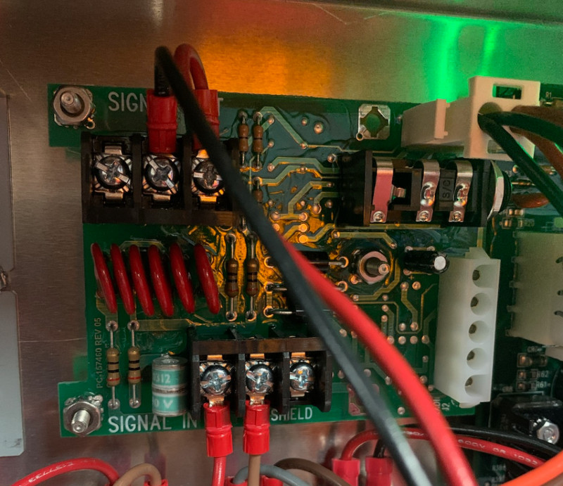 - Bypass surge card by disconnecting the signal in and signal out wires from the surge card and tying them together. This can be easily and reversibly done by moving the Signal In wires from their terminal block on bottom of card, and connecting those directly to the Signal Out terminal block on top of card.